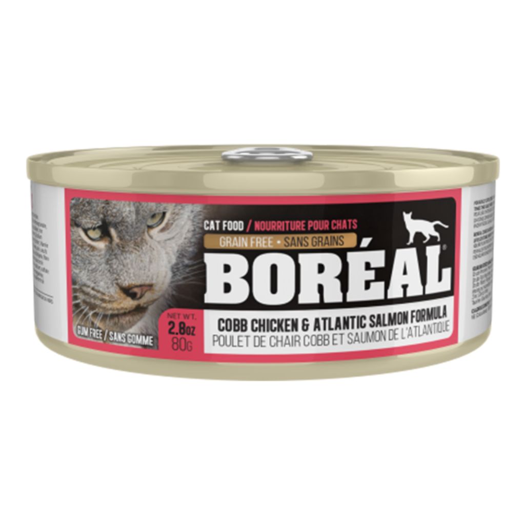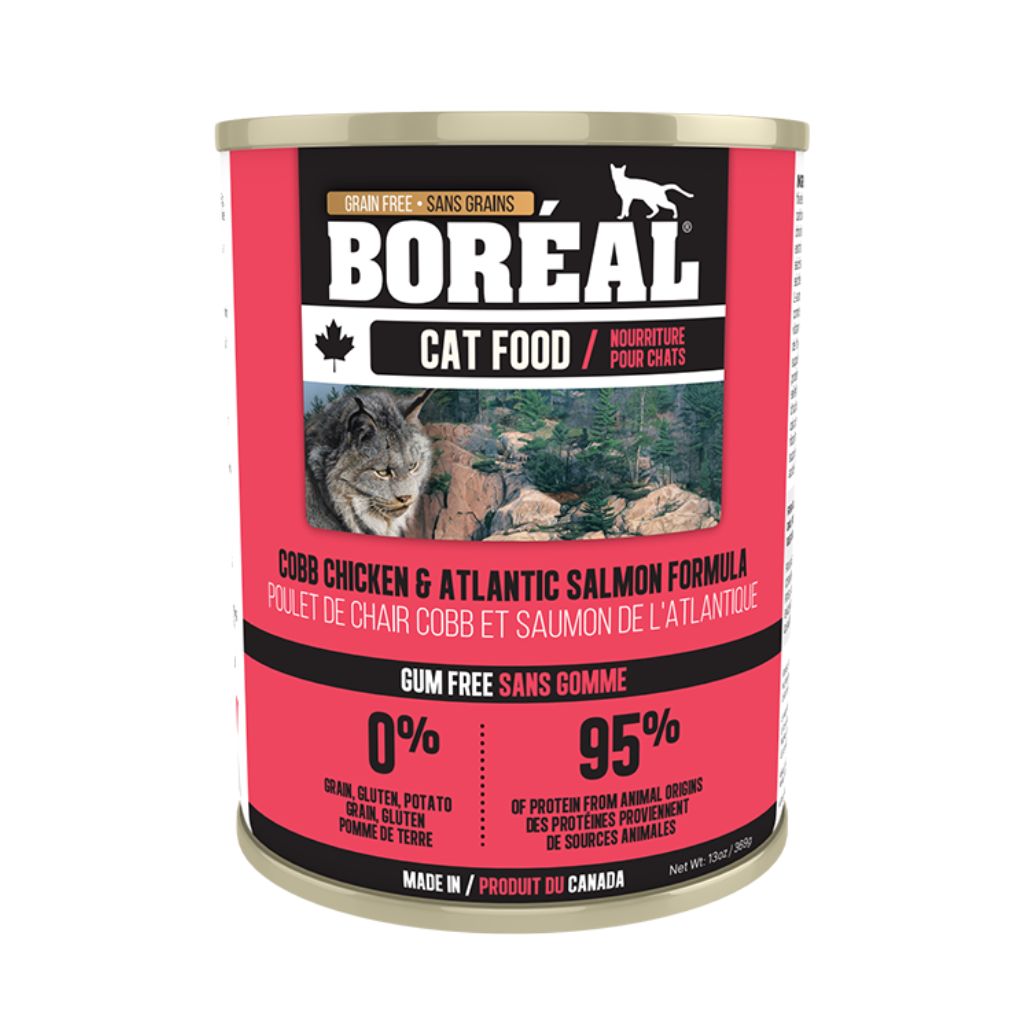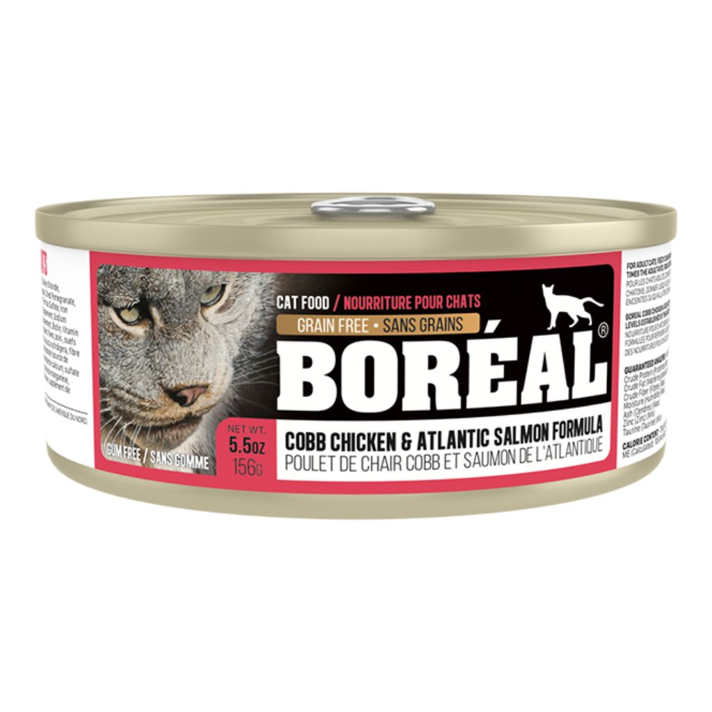 Boréal canned cat foods feature 95% protein from meat and fish, with almost no carbohydrates. This Canadian-made, gum-free, and gluten-free line includes Cobb Chicken and Atlantic Salmon, made from Canadian chicken and farm-raised salmon. It's free from grains, artificial colors, and thickeners, with added zinc and manganese for skin and coat health.