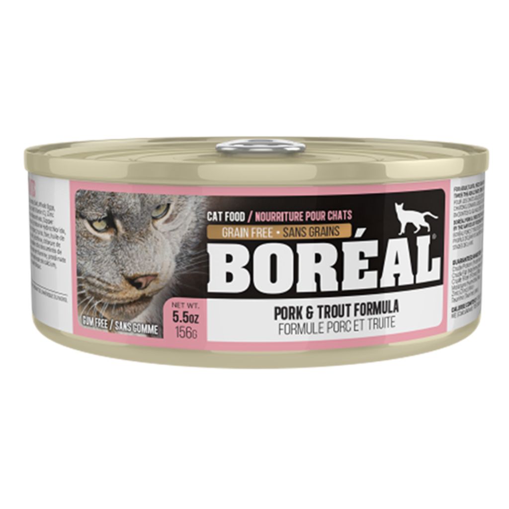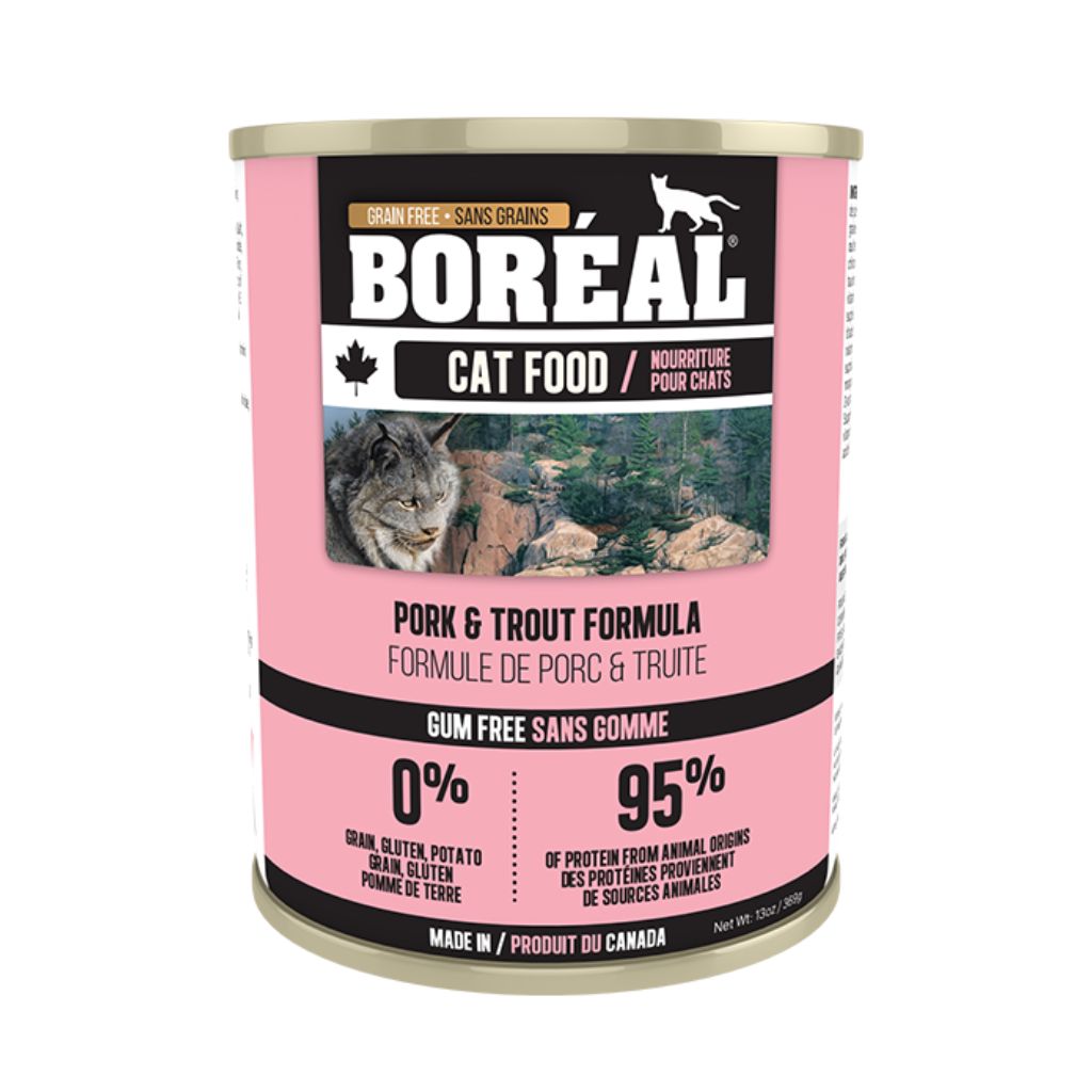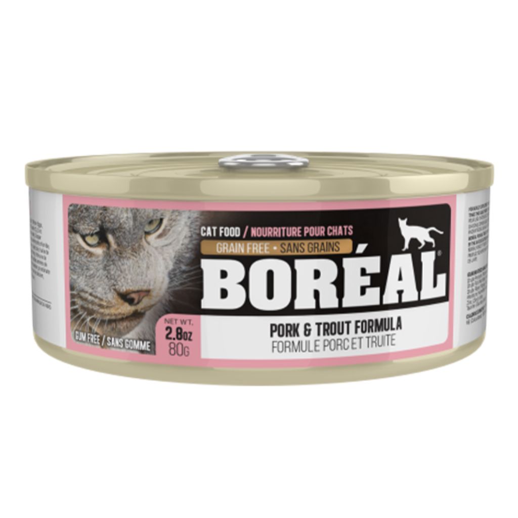 Boréal canned cat foods contain 95% protein from meat and fish, with minimal carbohydrates. This Canadian-made, gum-free, and gluten-free line includes Pork and Trout, made from Canadian pork and trout. It has no cereals, grains, artificial colors, or thickeners. Added zinc and manganese support skin health and coat quality, enhancing shine and integrity.