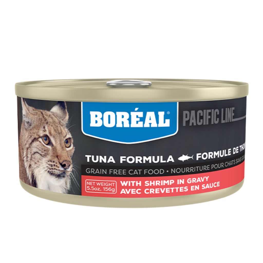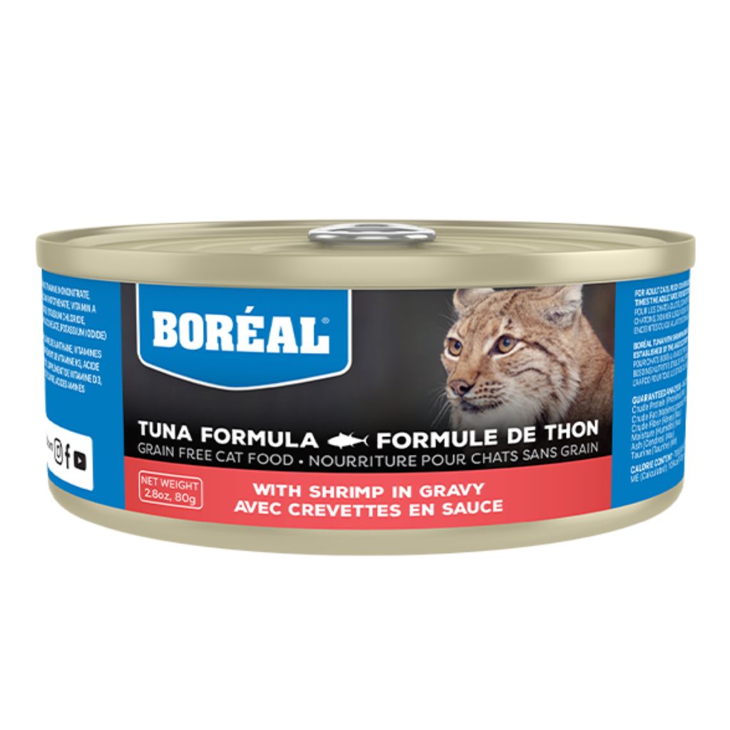 Boréal canned cat foods are 95% meat and are designed to have almost no carbohydrates to lower the risk of unwanted weight gain. This Red Tuna formula is made with dark muscle red tuna meat in gravy, and is topped with shrimp. Like all their canned cat foods, it is free of cereals, grains, artificial colour, or added salt. The Red Tuna line is not produced in Canada but in Thailand. It is produced in a facility that also produces food for humans, which are marketed all over the world.