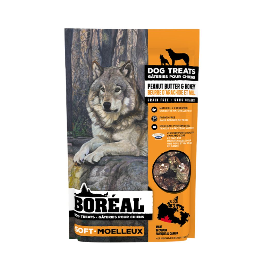 Boréal Peanut Butter & Honey Soft Dog Treats are deliciously crafted with local honey and peanut butter. Enhanced with added zinc, these treats support healthy skin and coat for your furry friend. Made in Canada with low glycemic index ingredients, they promote your pet's overall health and well-being!