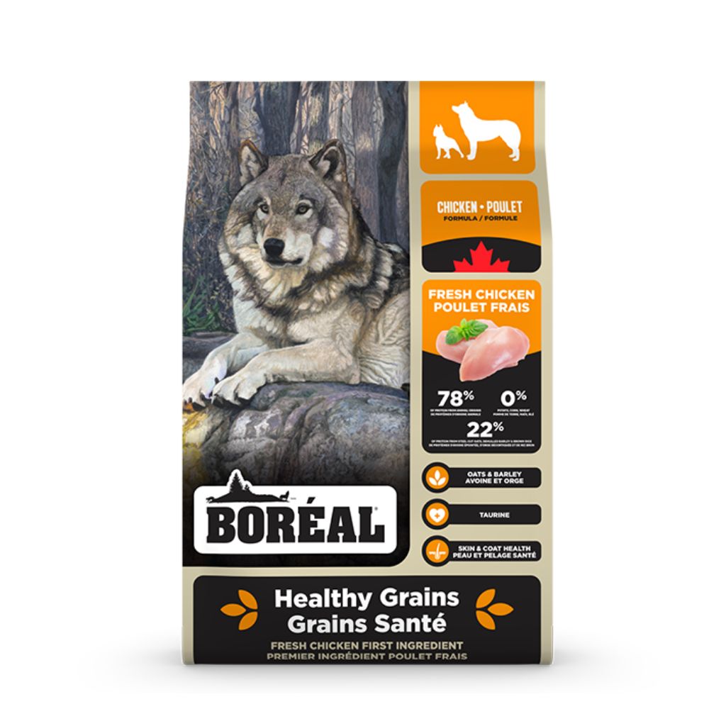 Boréal Healthy Grains Chicken is a high meat, low carb formula made with Canadian-sourced chicken, plus low-glycemic oats and barley as 'good grains'. Focused on low-glycemic ingredients for pet health, it includes prebiotics for digestion, taurine for heart support, and botanicals for gut health and antioxidants, ensuring balanced nutrition for your dog.