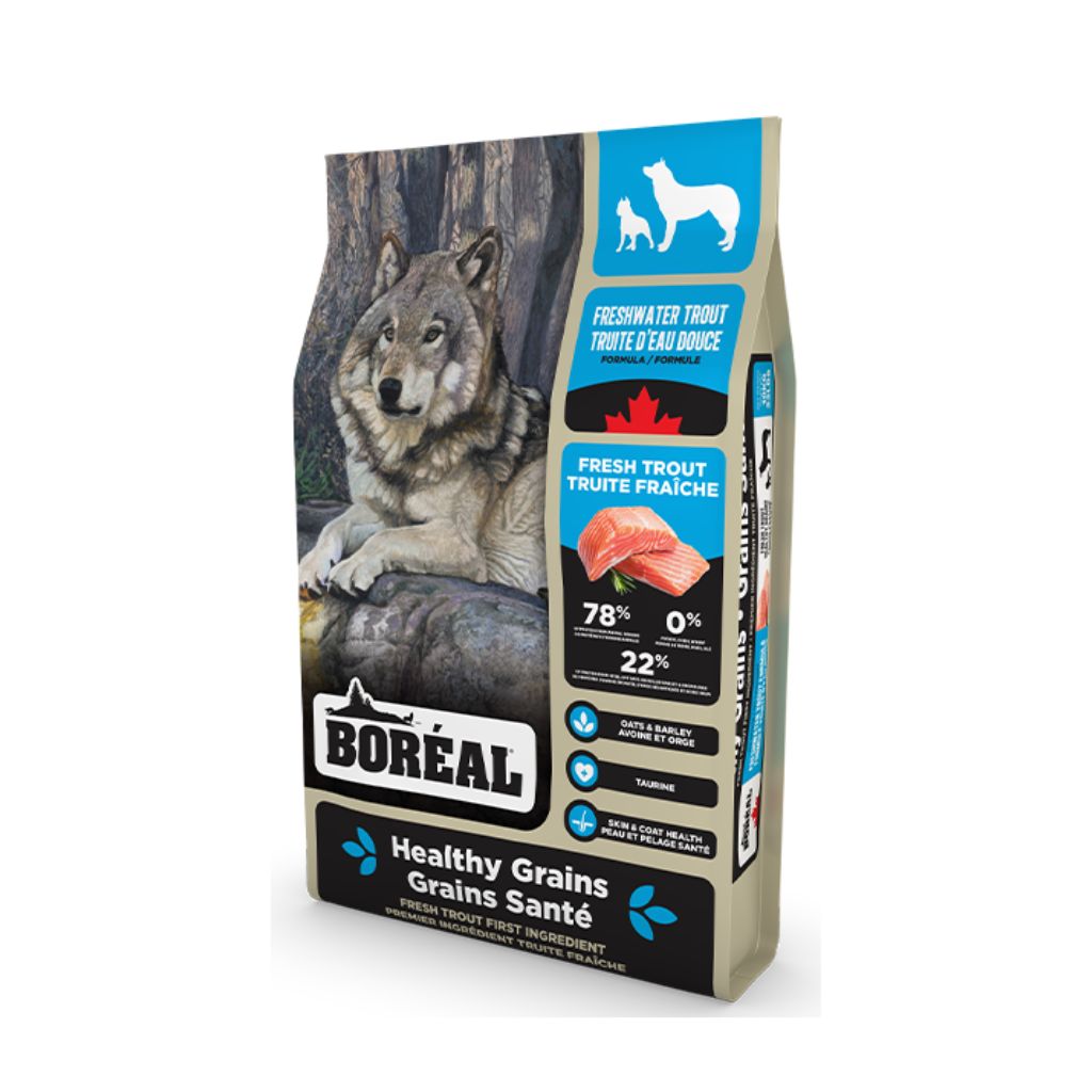Boréal Healthy Grains Freshwater Trout is a high meat, low carb formula made with Canadian-sourced trout, plus low-glycemic oats and barley as 'good grains'. Focused on low-glycemic ingredients for pet health, it includes prebiotics for digestion, taurine for heart health, and botanicals to support gut health and provide antioxidants, delivering balanced nutrition for your dog.