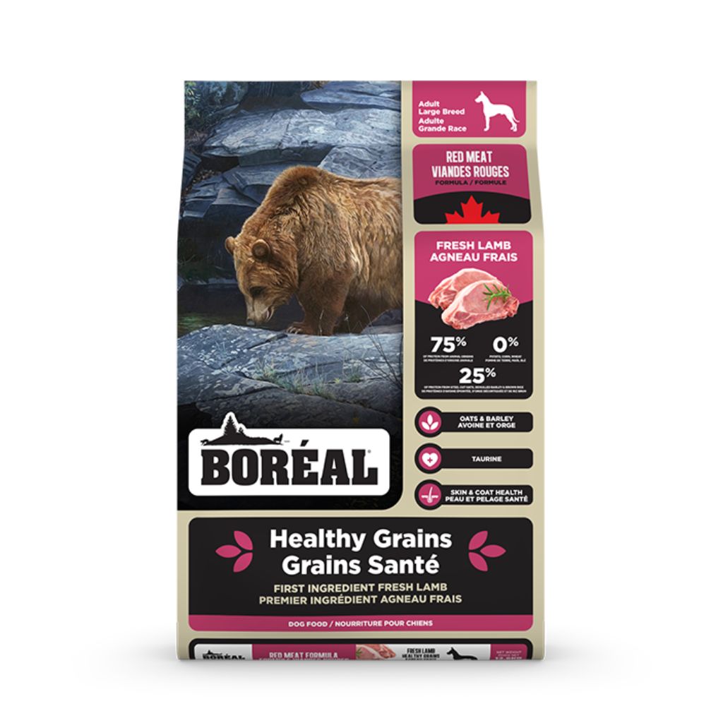 Boréal Healthy Grains Red Meat is a high meat, low carb dog food made with Canadian-sourced red meat, plus low-glycemic oats and barley as 'good grains'. Focused on low-glycemic ingredients for health, it includes prebiotics for digestion, taurine for heart health, and botanicals to support gut health and provide antioxidants, promoting overall wellness in your pet.