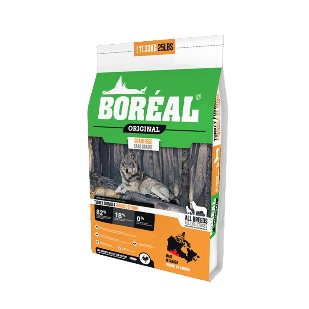 Boréal Original Turkey diet is a grain-free dog food made with fresh turkey meat and chicken meal. This everyday diet helps maintain your dog's weight while providing balanced nutrition. Beans and peas replace grains, and beneficial herbs and fruits like blueberries and cranberries enhance flavor and add antioxidants for additional health benefits.