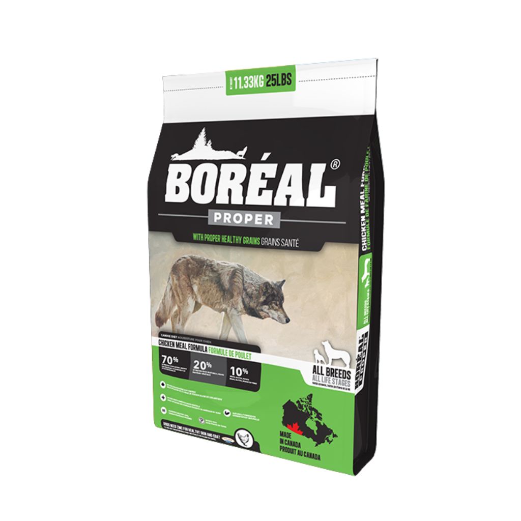 Boréal Proper Chicken Meal Formula is an all-breed diet crafted with Canadian chicken and a low glycemic base of peas and beans. This grain-inclusive food features oats and barley, helping your pet feel full longer. Prebiotics support digestion, taurine promotes heart health, and unique organic minerals enhance coat color and improve mobility.