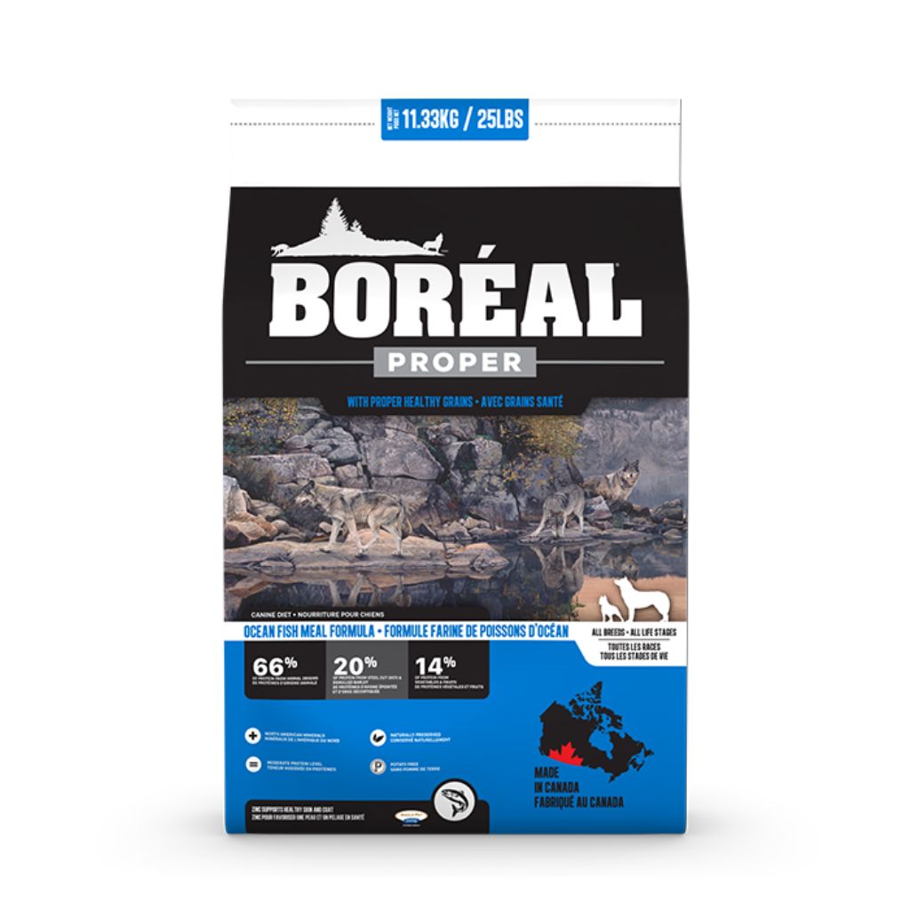 Boréal Proper Ocean Fish Meal Formula is an all-breed diet made with Canadian herring and a low glycemic base of peas and beans. This grain-inclusive food includes oats and barley, promoting satiety for your pet. Prebiotics aid digestion, taurine supports heart health, and unique organic minerals enhance coat color and improve mobility.