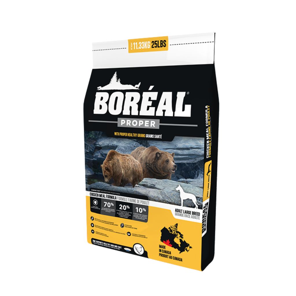 Boréal Proper Large Breed Chicken Meal Formula is crafted for all breeds, featuring Canadian chicken and a low glycemic base of peas and beans. This larger kibble size has reduced protein levels to help manage the growth rate of large breeds. Enhanced with prebiotics for digestion, taurine for heart health, and unique organic minerals for better coat color and mobility.