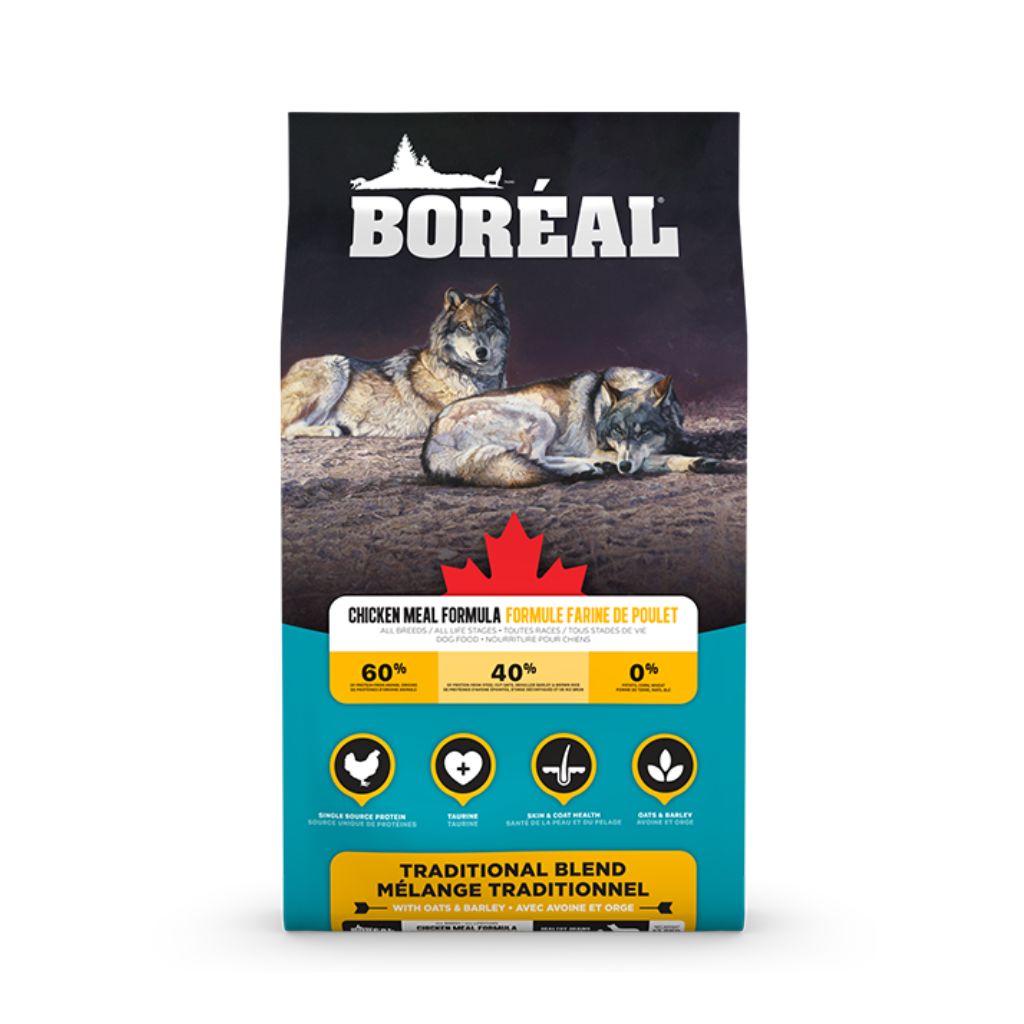 Boréal Traditional Blend Chicken Meal Formula features Canadian chicken with low-glycemic oats and barley for balanced nutrition. Focused on low-glycemic ingredients to support pet health, it includes taurine for heart health and organic minerals for a shiny coat and better mobility. Made with care from Canadian farms and fisheries.