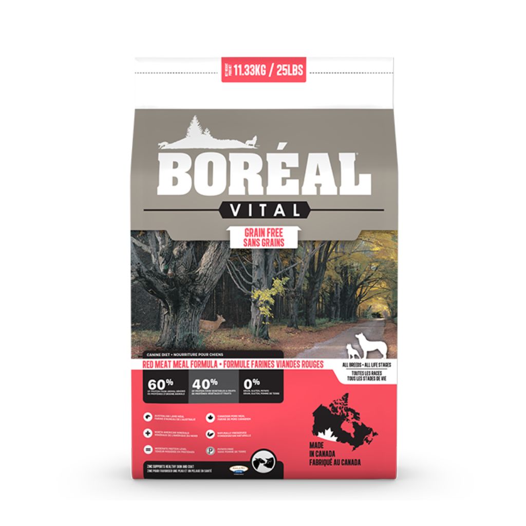 Boréal Vital All Breed Red Meat Meal is a grain-free, limited-ingredient diet designed for weight control and hypoallergenic needs. It uses beans and peas as low glycemic replacements for grains, helping dogs feel full longer. Sourced from Canadian pork and Australian lamb, it includes prebiotics for digestion, taurine for heart health, and organic minerals for improved coat color and mobility.