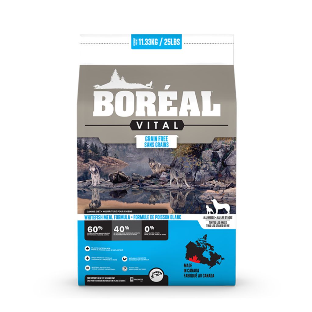 Boréal Vital All Breed Whitefish Meal is a grain-free diet featuring Canadian Atlantic whitefish as a single source protein. This everyday formula helps manage weight and is hypoallergenic. With a base of beans and peas to replace grains, it’s low glycemic to keep dogs feeling full longer. Enhanced with prebiotics for digestion, taurine for heart health, and organic minerals for coat color and mobility.