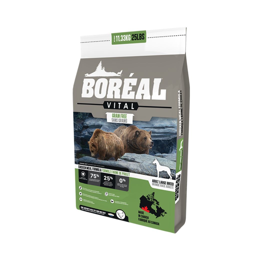 Boréal Vital Large Breed Chicken Meal is a grain-free diet featuring Canadian chicken as the single source protein. Designed for everyday use, this larger kibble helps manage weight and serves as a hypoallergenic option. With a base of beans and peas to replace grains, it's low glycemic to keep dogs feeling full longer. Enhanced with prebiotics for digestion, taurine for heart health, and organic minerals for better coat color and mobility.