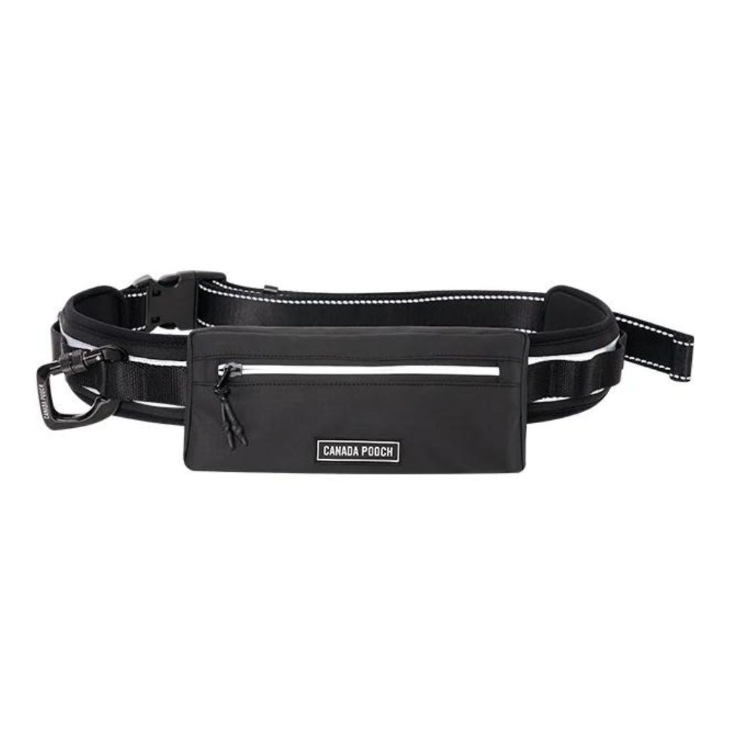 The Canada Pooch Dog Walking Utility Belt attaches to your leash with the extra-strength, rust-proof carabiner for hands-free dog walking. It adjusts from 23" to 53" and features premium quality webbing for strength and durability. The reinforced loop system allows for customization of clip-on accessories. The water-resistant pocket fits most phones, keys, and credit cards. The belt features neoprene padding and reflective details for added visibility. It's the perfect accessory for an enjoyable walk!