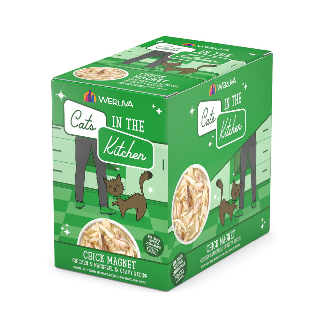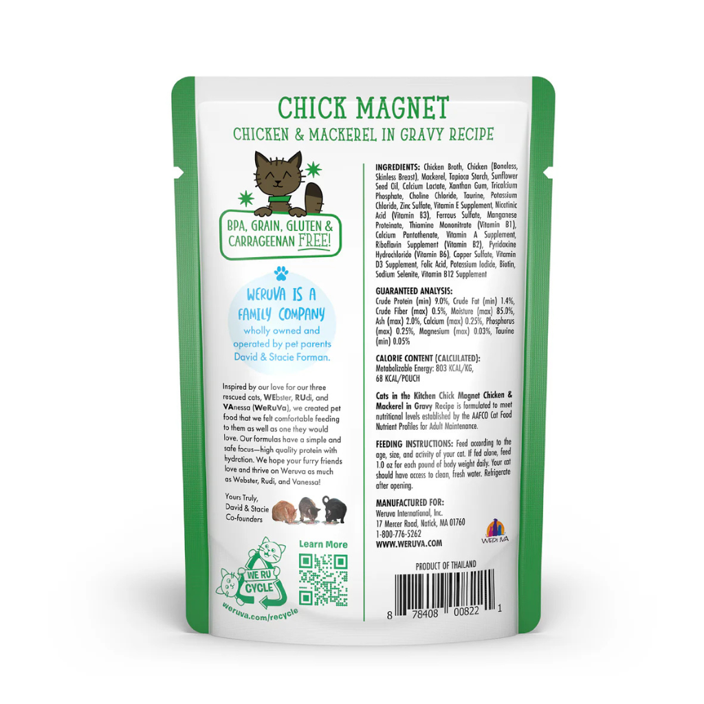 Chick Magnet in Gravy features boneless, skinless white breast meat chicken and wild-caught mackerel. This meal is free from grain, gluten, BPA, and carrageenan. Recycle used pouches with WeRuCycle for eco-friendly disposal.