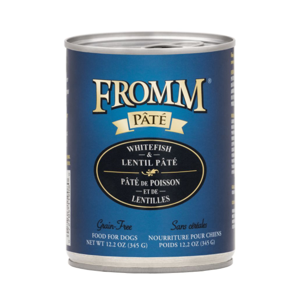 Fromm Grain Free Dog Whitefish & Lentil Paté features finely minced whitefish simmered in flavorful fish broth with wholesome lentils, sweet potatoes, and carrots. This paté offers complete and balanced nutrition for every life stage and lifestyle. Serve it on its own or as a tasty complement to your dog's dry food for a nutritious and satisfying meal!