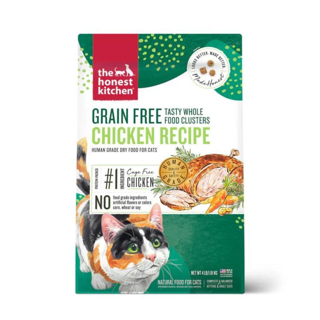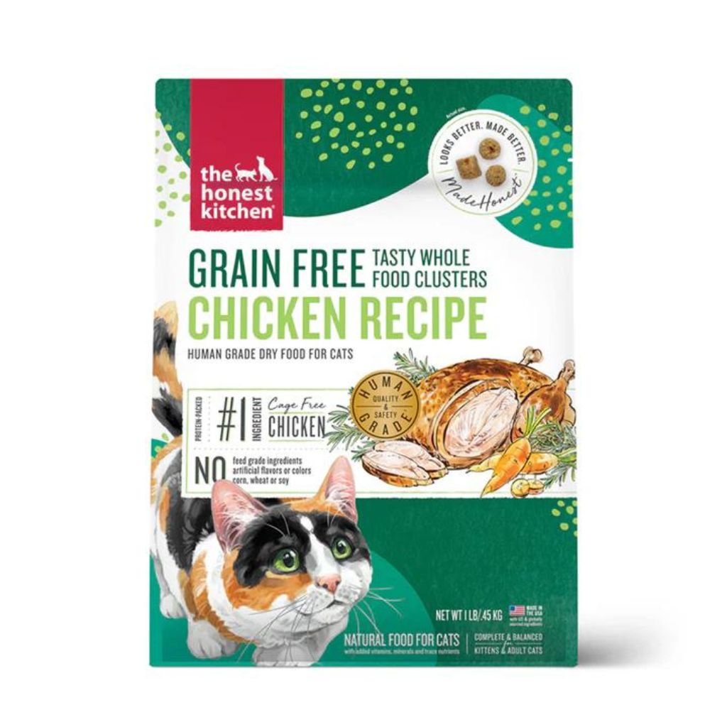 The Honest Kitchen Whole Food Clusters are grain-free, contain no by-products, chemicals, or artificial preservatives, and are free of corn, wheat, soy and GMO ingredients. They are suitable for cats of all life stages and breeds.