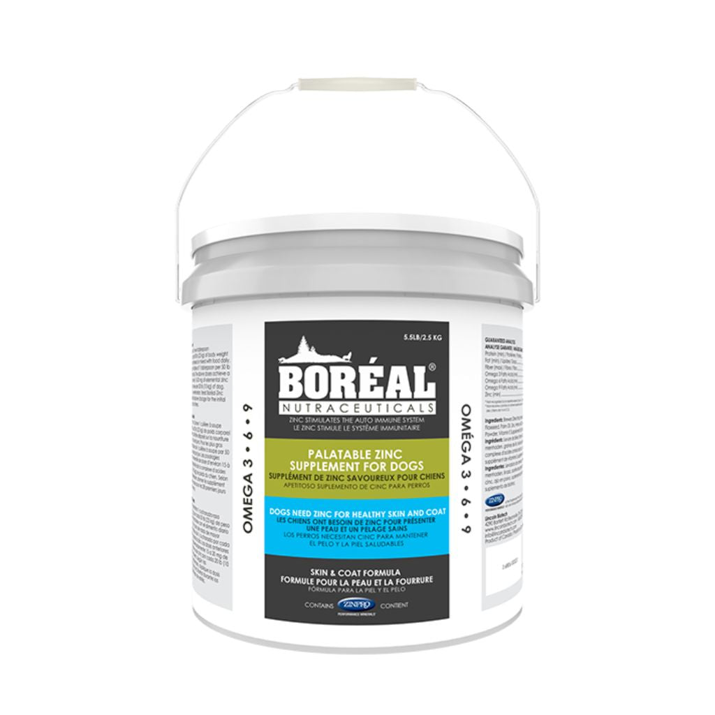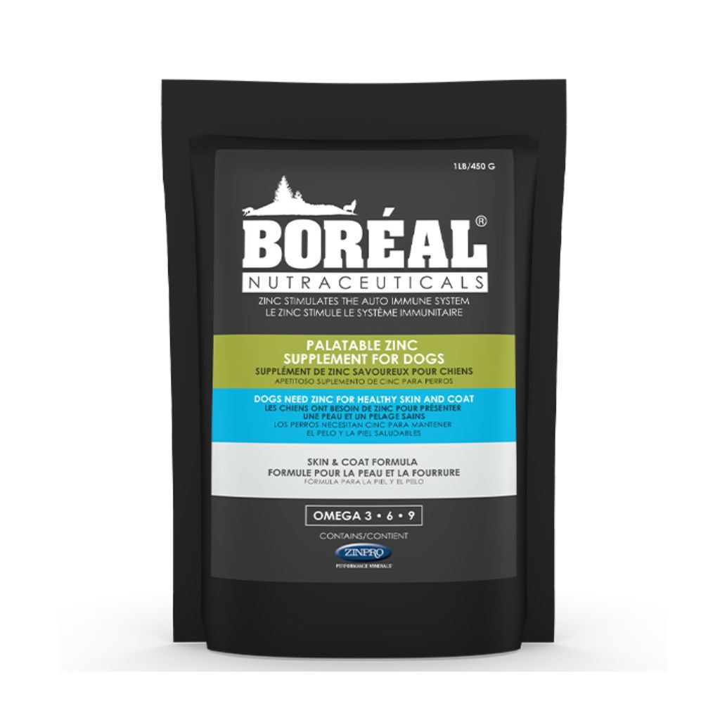 Zinc serves two important functions in dogs: enzyme function and protein synthesis. It plays a key role in maintaining a healthy coat and normal pigmentation of hair. Boréal Palatable Zinc Supplement For Dogs contains ZINPRO, a patented organic zinc source from Zinpro Performance Minerals. It uses methionine, an amino acid, to bond with zinc, ensuring direct absorption into the bloodstream for maximum effectiveness.