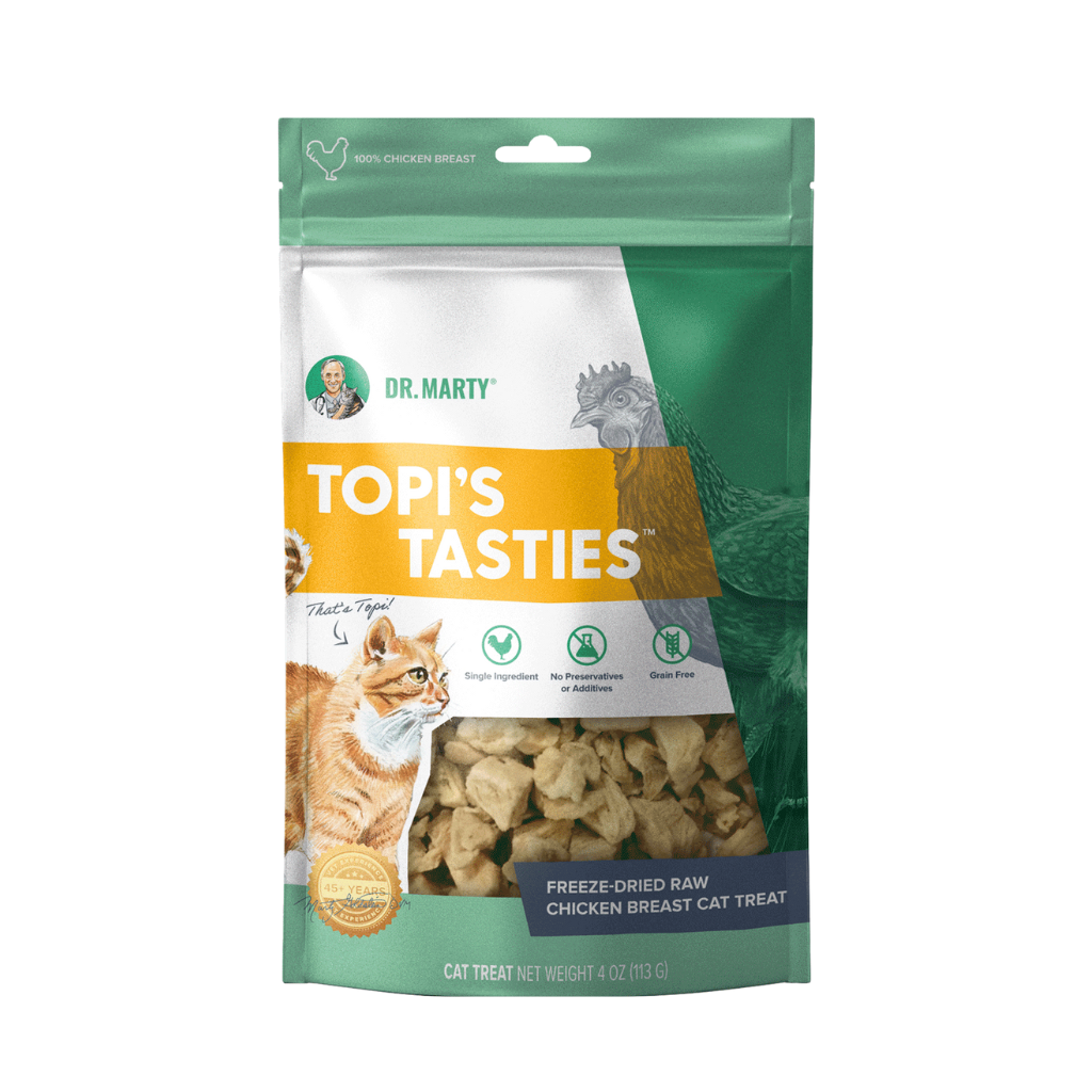 Topi’s Tasties are 100% freeze-dried chicken breast treats packed with premium protein to support your cat’s strong muscles, shiny coat, and healthy heart. Naturally nutrient-rich and irresistibly flavorful, these treats are a wholesome snack your kitty will love!