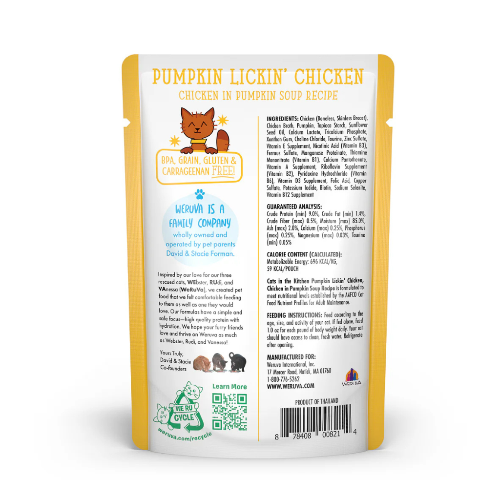 Pumpkin Lickin' Chicken in Pumpkin Soup features tender, boneless, skinless white chicken breast in a savory pumpkin soup. It’s grain-free, gluten-free, BPA-free, and carrageenan-free. Recycle used pouches with WeRuCycle for added sustainability.
